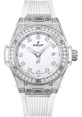 33 mm polished stainless steel case set with 130 diamonds for 0.4ct, polished stainless steel bezel set with 36 diamonds for 0.76ct, sapphire crystal with anti-reflective treatment, polished white dial set with 11 diamonds, HUB1120 self-winding movement, approximately 40 hours of power reserve, white structured lined rubber strap, stainless steel deployant buckle. Water resistant to 100m (10 ATM).