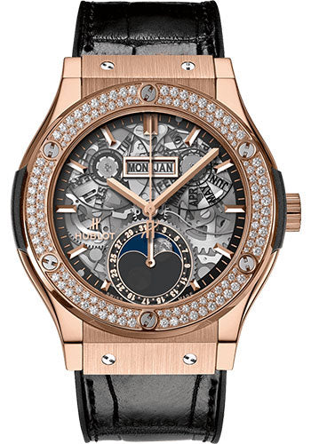 42 mm polished and satin-finished 18k king gold case, polished 18K king gold bezel set with 138 diamonds totaling 1.01cts with, 6 H-shaped titanium screws, sapphire crystal with anti-reflective treatment, sapphire dial, HUB1131 self-winding moonphase movement, approximately 42 hours of power reserve, black rubber and alligator leather strap, 18K king gold and black-plated stainless steel deployant buckle. Water resistant to 50m (5 ATM).